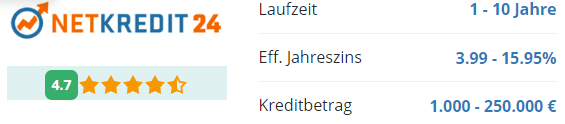 Die Wahl des richtigen Privatkredits kann eine Herausforderung sein, aber mit Netkredit24 wird es einfach und unkompliziert. Vergleichen Sie Kredite bis 250.000€ und finden Sie den besten Zinssatz!